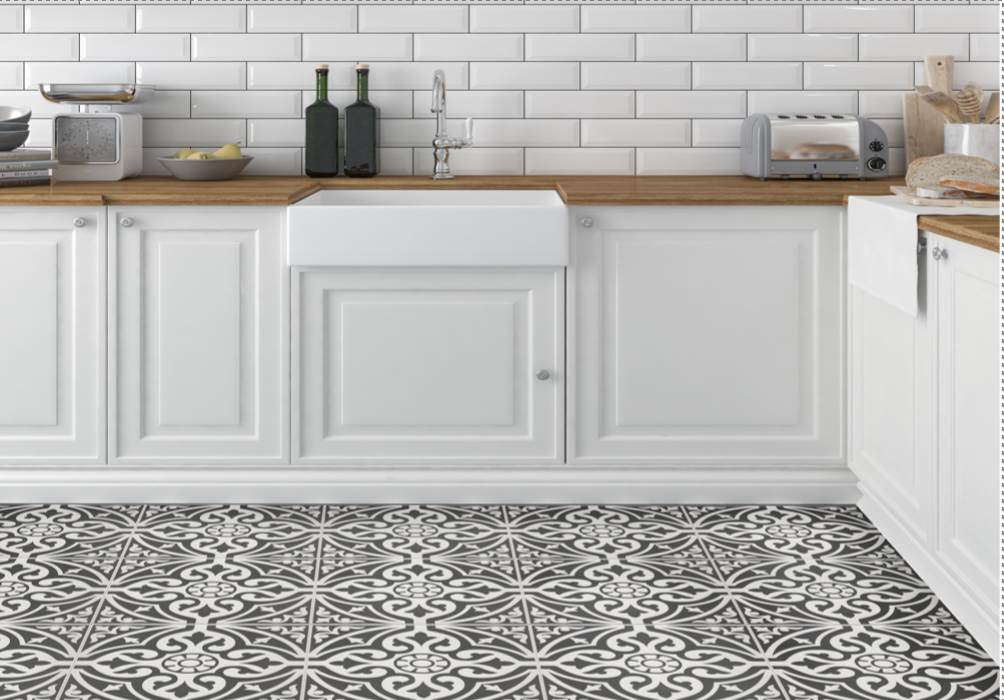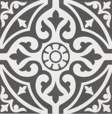 Porcelain non-rectified patterned tiles featuring a contrasting black detail on a white background. These tiles are suitable for use on wall or floor.