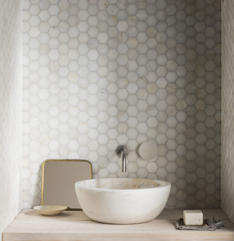 We couldn’t resist the dense milk-white background and delicate amber veins of our Calacatta Amber Honed Marble Hexagon Mosaic Tile. Sophisticated, warm and subtle, this marble hexagon tile looks divine in bathrooms and other indoor living spaces.