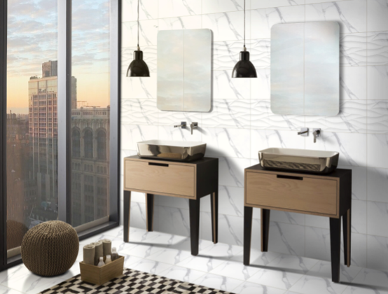 Matt carrara marble effect ceramic tiles available in both a flat and relief wave decor. These tiles are suitable for use on walls. Also available in gloss.
