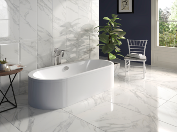 Porcelain calacatta marble effect tiles with a non-rectified edge and gloss finish. Suitable for use on both wall and floor.