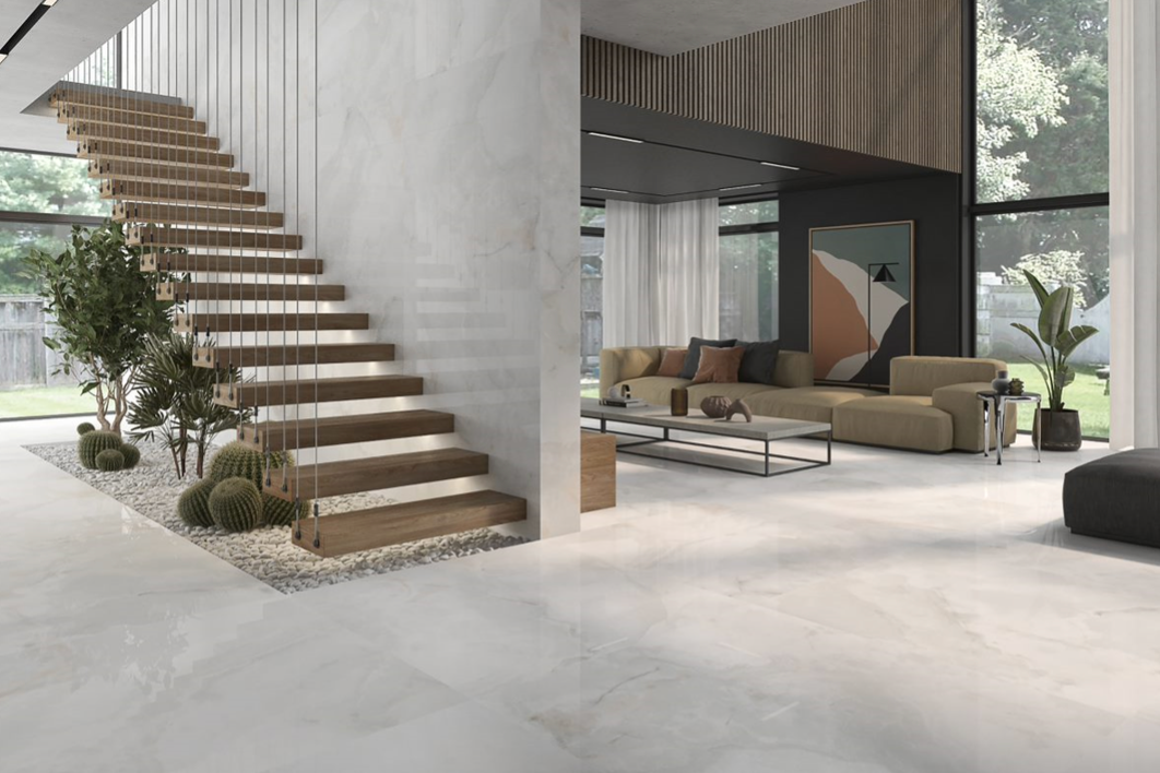 Large format tiles with an authentic onyx replication featuring layered tones of pearl and powder white. Rectified with a polished finish, these tiles are suitable for use on wall and floor.