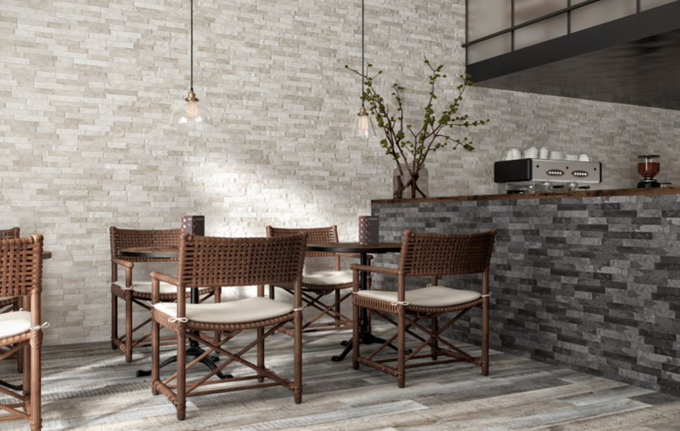 Porcelain natural stone split-face effect tiles with a matt relief finish. These tiles are suitable for use on walls, indoor and out.