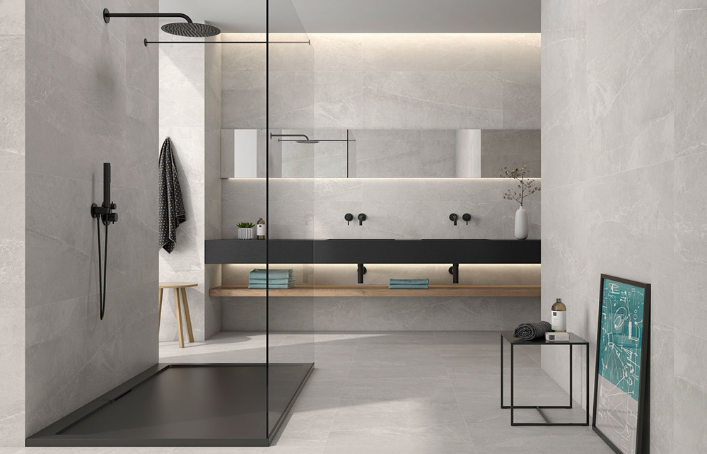 This tile features a beige stone effect with a complimentary relief wave décor available in a matt finish. Sizes available in 33x55 ceramic wall tile and 60.8 x 60.8 porcelain floor tile.