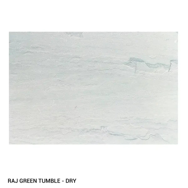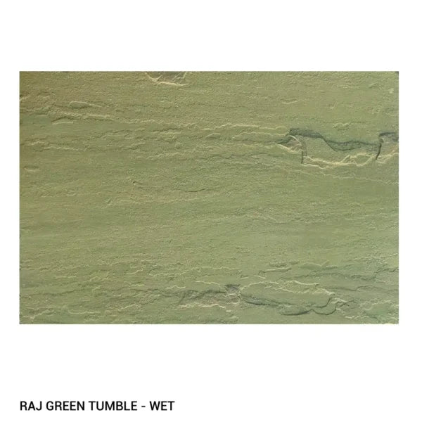 - Description: Raj Green Tumbled Sandstone, with its mix of colours dominated by a subtle light green. It is lighter than the other riven sandstones, this tumbled sandstone paving blends well in a wide range of traditional settings, immediately looking long-established.
