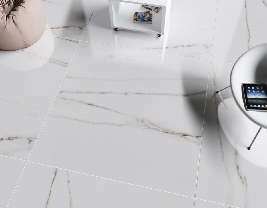 Striking large format tiles with a highly polished finish. Imitating real Statuario marble, these tiles feature a white body with a warm grey veining. Suitable for use on both wall and floor.